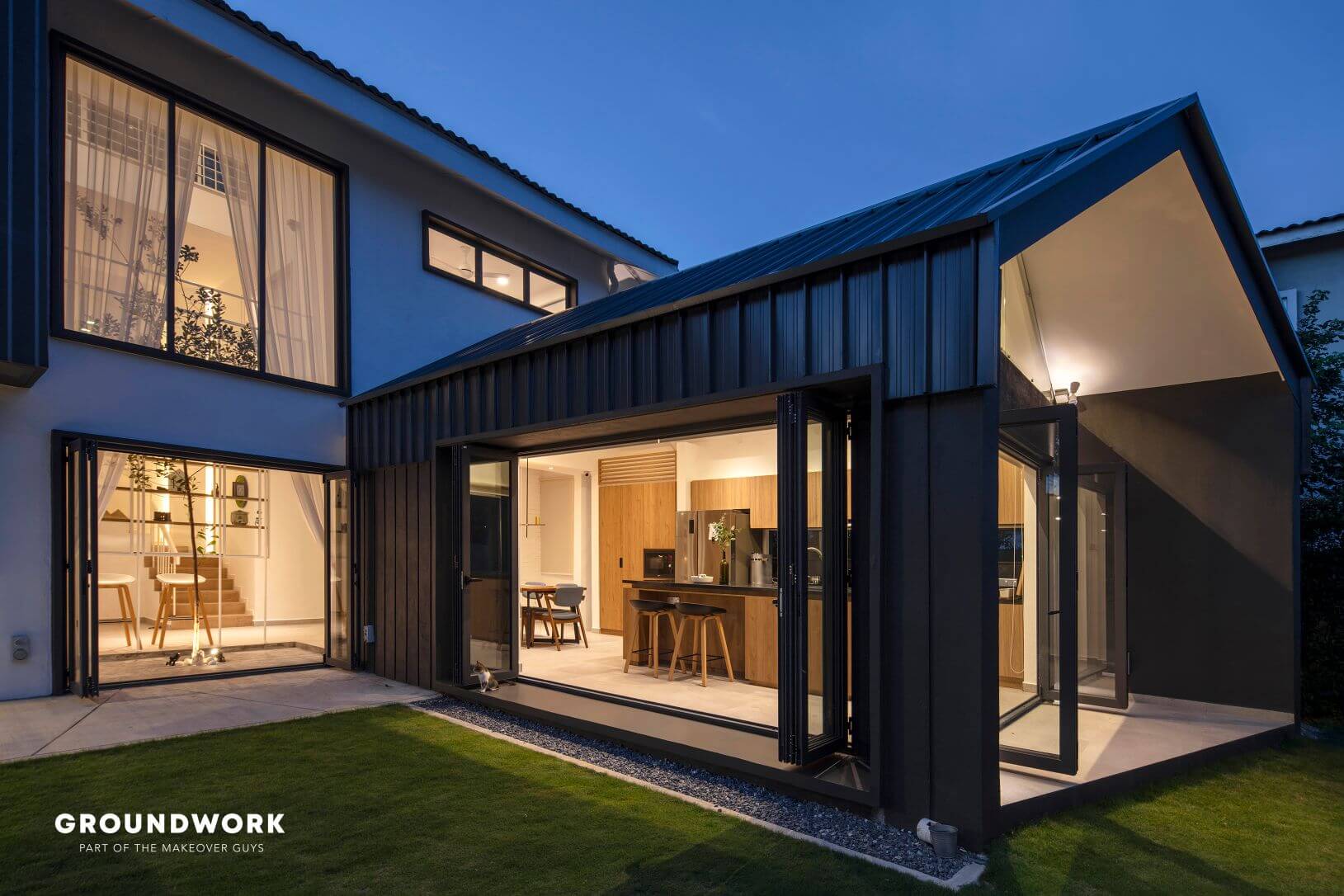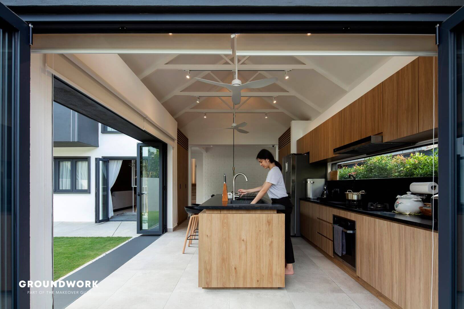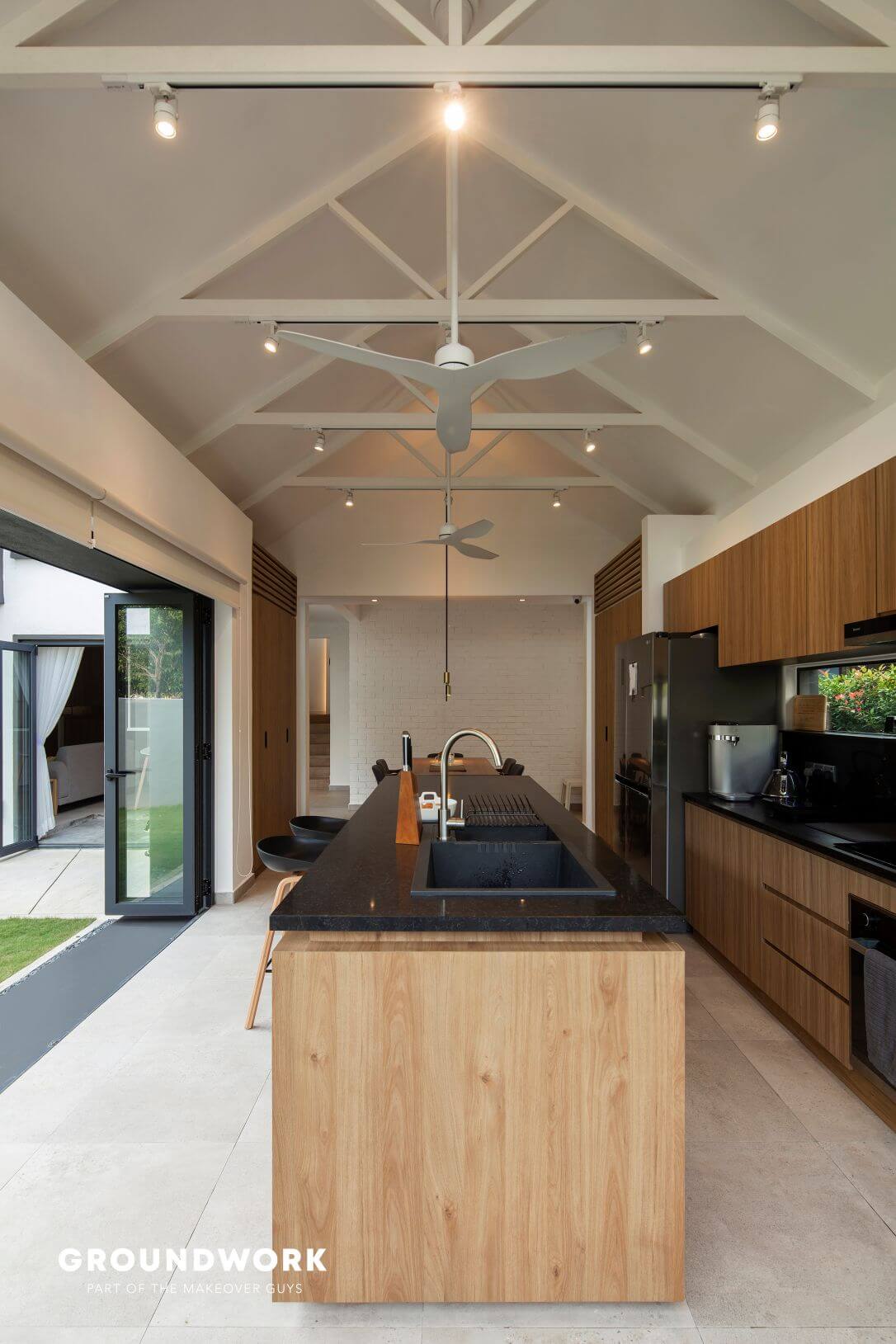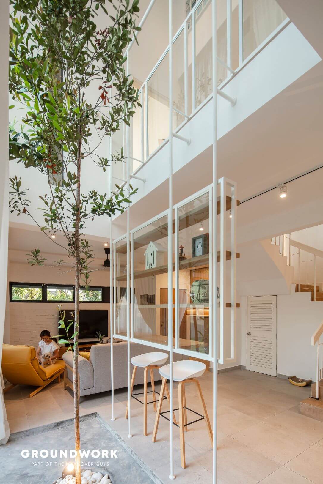 The living room carves out a void space with a tree (tristania obovata) for a centrepiece. This creates a visual continuity of ground level and first level while enhancing views and lighting quality inside, allowing the experience of passage in time indoors. Natural sunlight also coincides with the home’s car porch and bathrooms through the thoughtful usage of skylights and windows. As for the new extended kitchen, it connects seamlessly to the outdoor garden, perfect to fuel their passion for cooking, have interactions with resident furry friends and occasional pleasure to have relaxing guests visits.