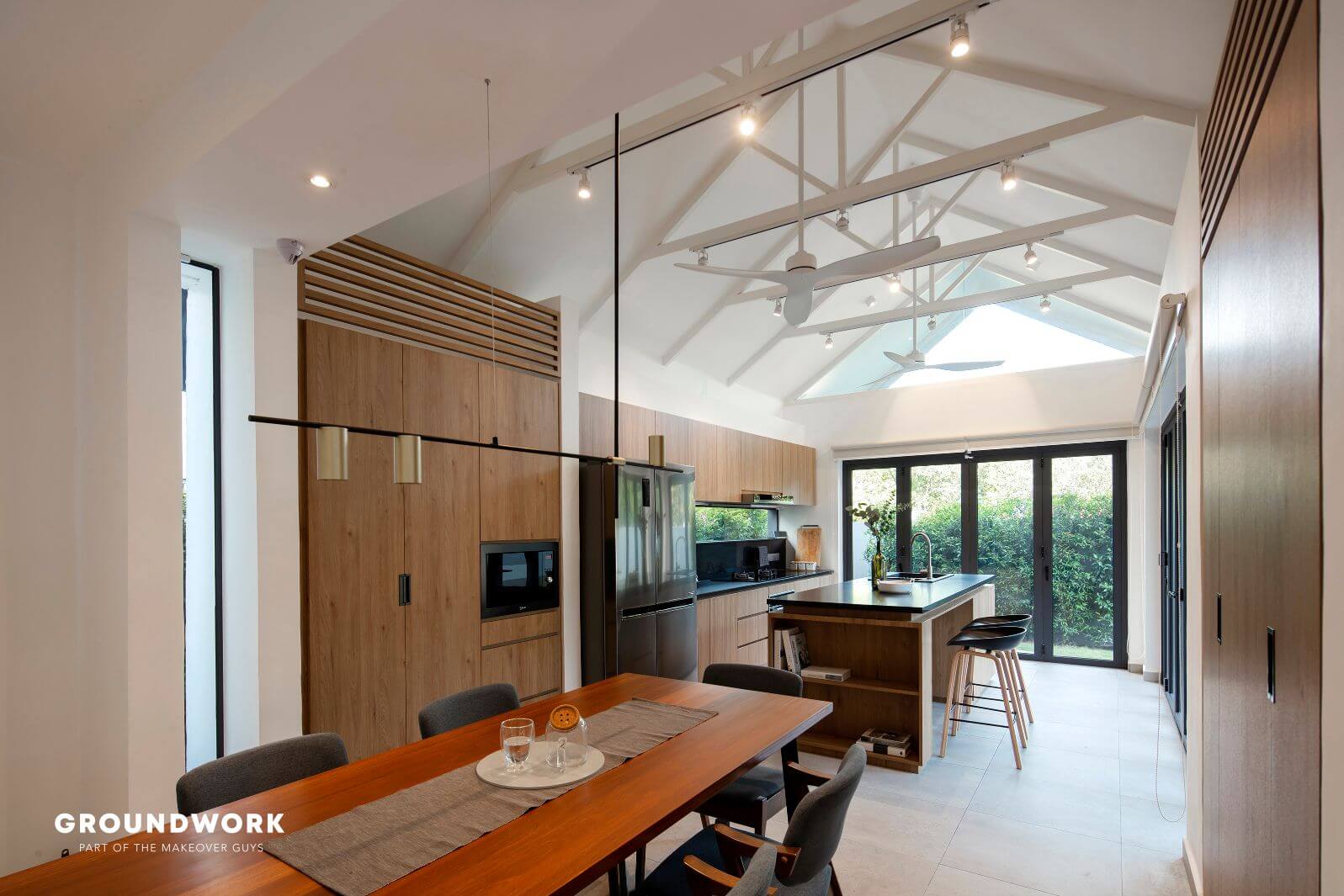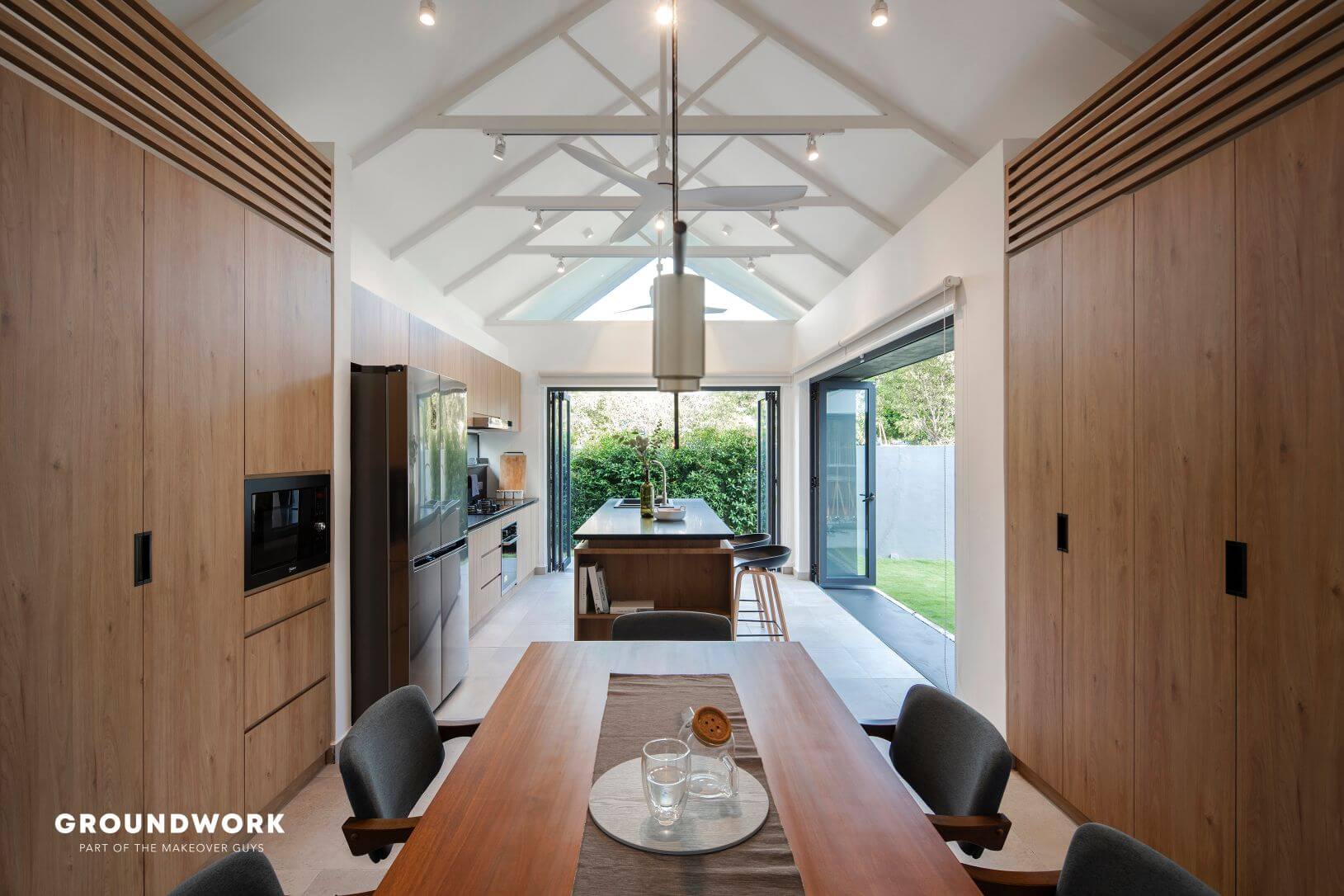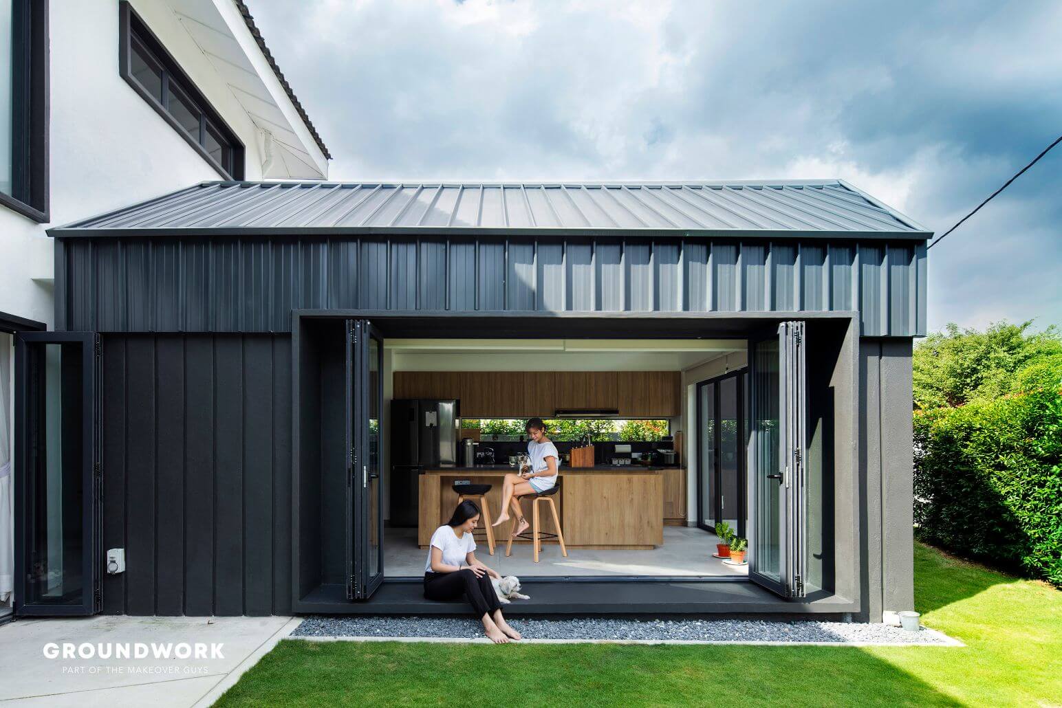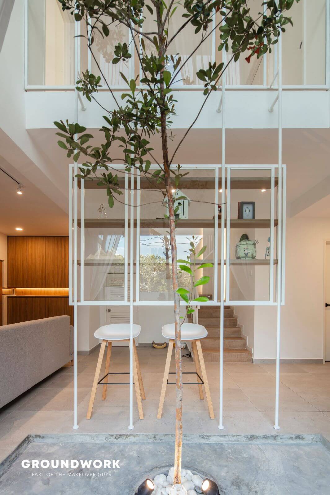 The living room carves out a void space with a tree (tristania obovata) for a centrepiece. This creates a visual continuity of ground level and first level while enhancing views and lighting quality inside, allowing the experience of passage in time indoors. Natural sunlight also coincides with the home’s car porch and bathrooms through the thoughtful usage of skylights and windows. As for the new extended kitchen, it connects seamlessly to the outdoor garden, perfect to fuel their passion for cooking, have interactions with resident furry friends and occasional pleasure to have relaxing guests visits.